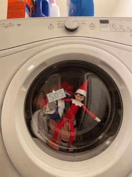 Avec du papier collant, colle le lutin à l’intérieur de la porte de la laveuse (idéalement sans qu’elle soit en marche, évidemment! ) et ajoute un petit mot qui dit « SOS! » ou « Aidez-moi! ». On dirait qu’il voulait peut-être se laver après tous ses mauvais coups… ou qu’il a simplement confondu la laveuse avec un toboggan magique du Pôle Nord!