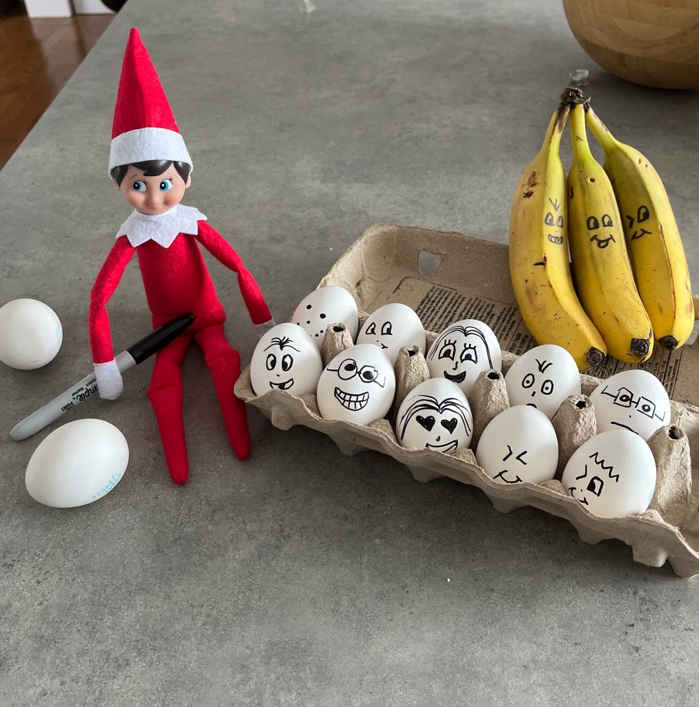 • Le lutin a dessiner des visages drôles sur des œufs, des oranges ou d’autres aliments. Il pourrait même en faire une galerie d’art, en collant des petits yeux sur tous les aliments du frigo!