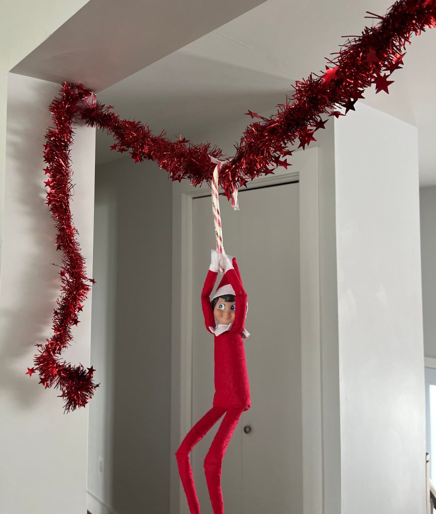 Accroche des guirlandes de Noël d’un bord à l’autre d’un cadre de porte et suspends ton lutin après une canne de bonbon pour qu’il ait l’air de faire de la tyrolienne.